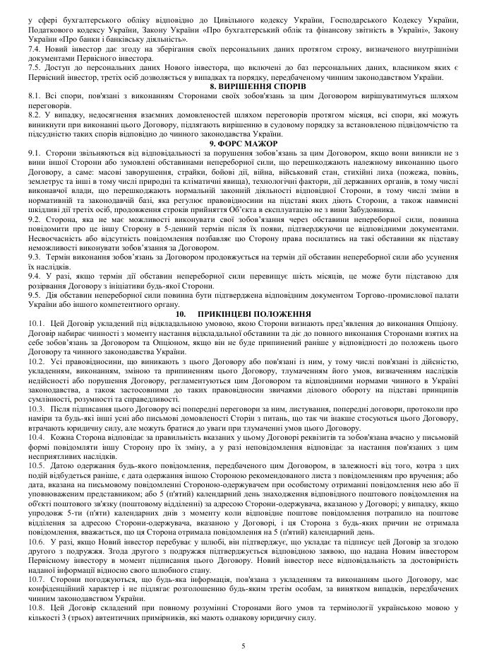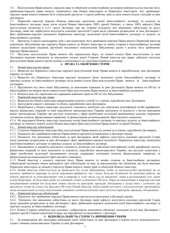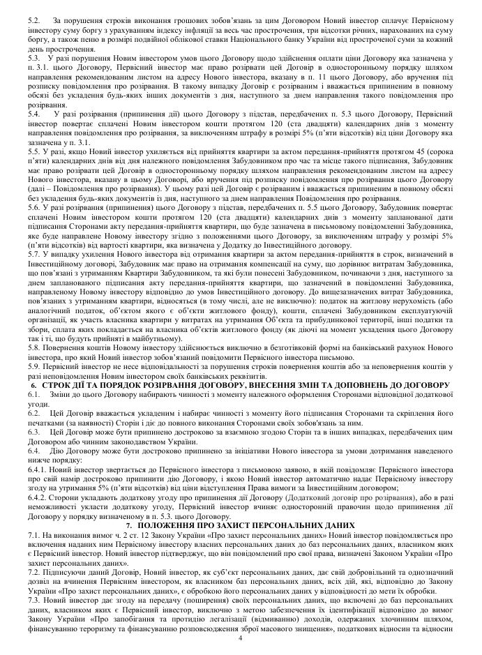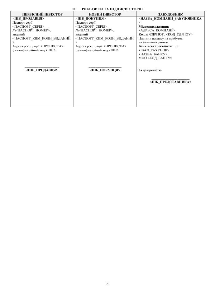 Форма договору переуступки завжи має бути письмовою, зі згодою зі сторони забудовника. При цьому забудовник може брати комісію з угоди, зазвичай вона складає $100 або 1% від суми договору.